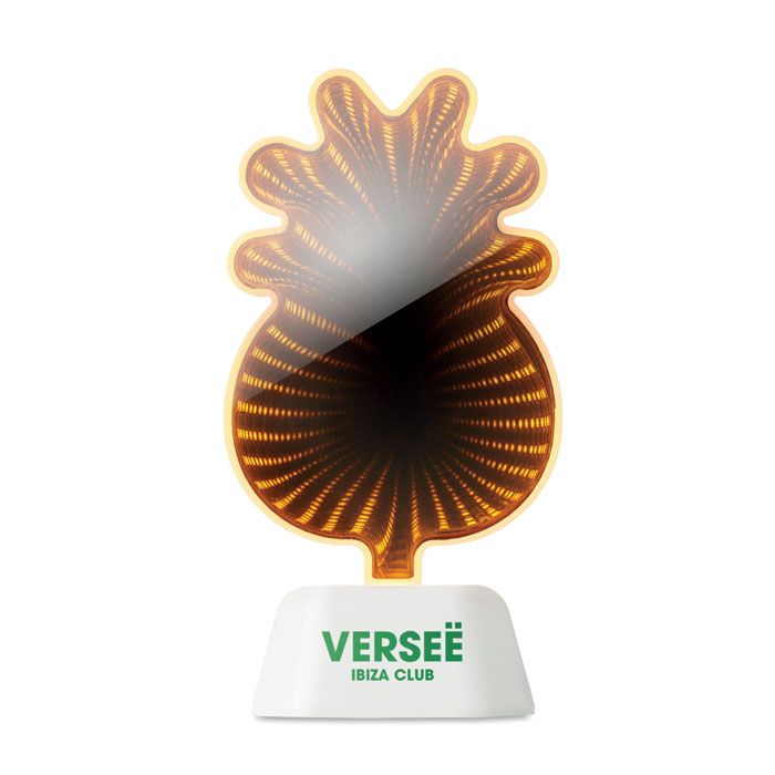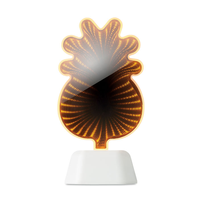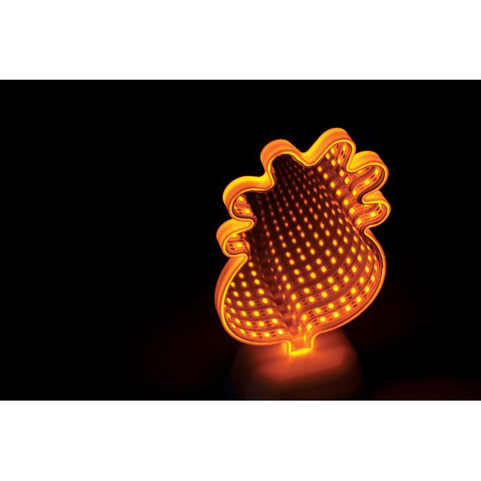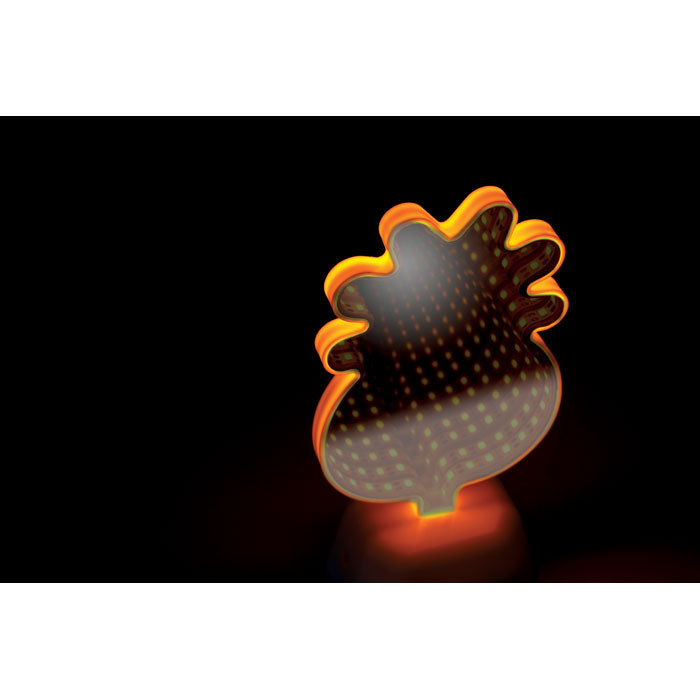 3D Pineapple shaped lamp with infinity tunnel illusion mirror. In the daylight, you can use it as an ordinary mirror. 3x AA batteries not included.