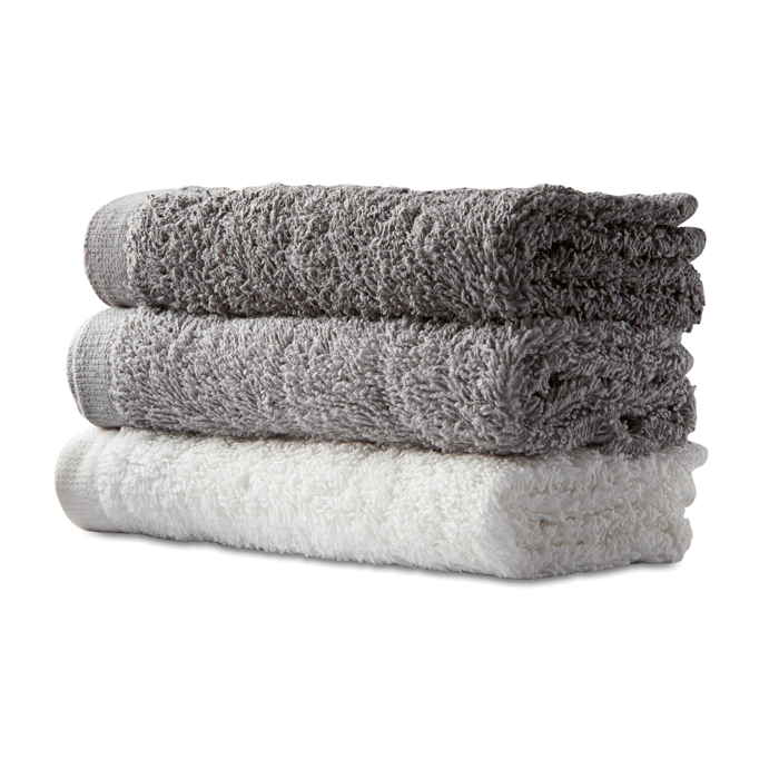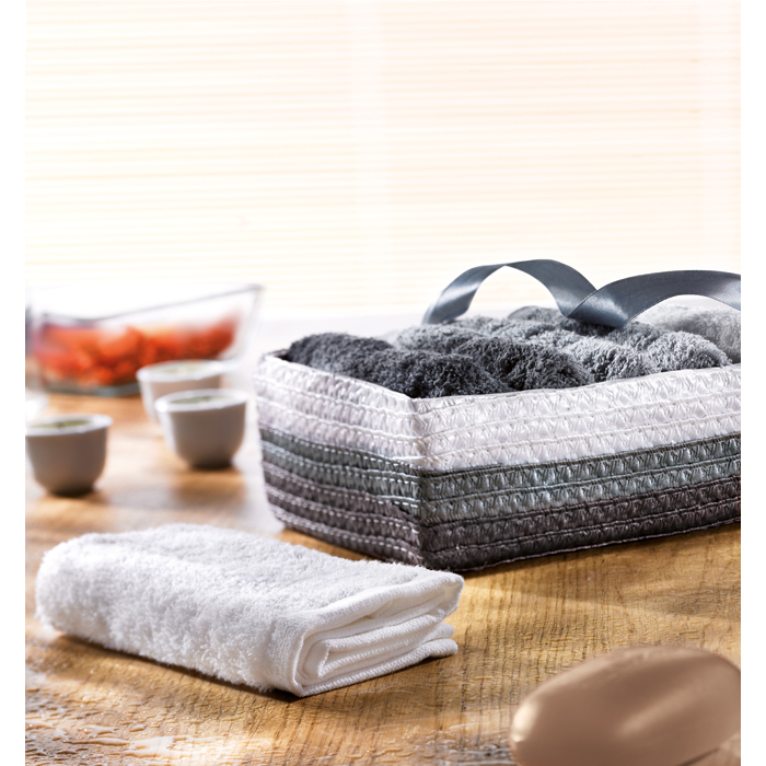 Set of 6 facial or hand towels presented in matching PP basket with ribbon. 100% cotton, 330 gr/m2. Towel size: 30×30 cm.