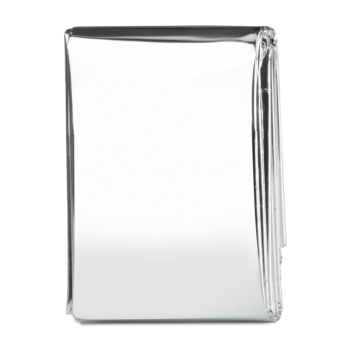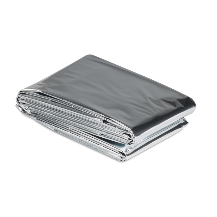 Emergency blanket made in shiny silver PET. Helps retain body heat.