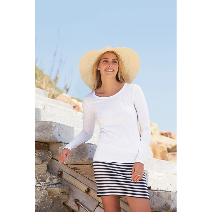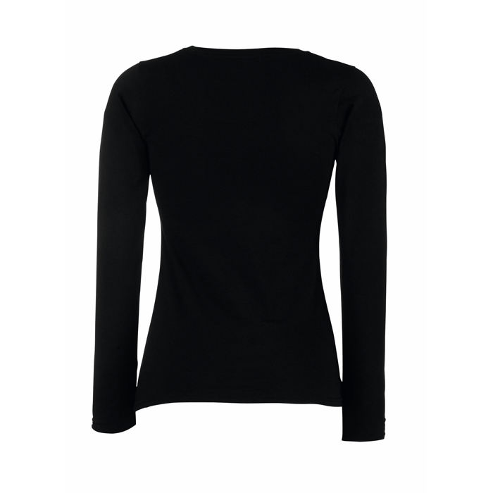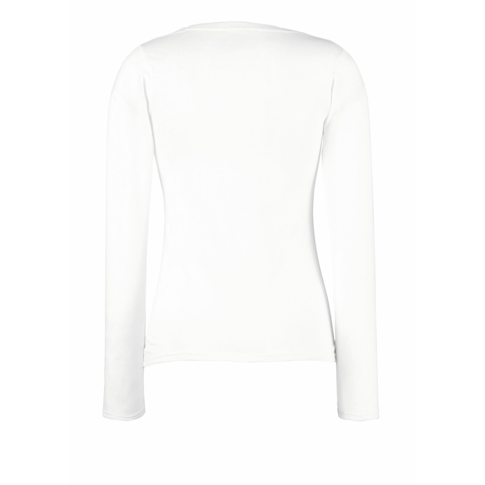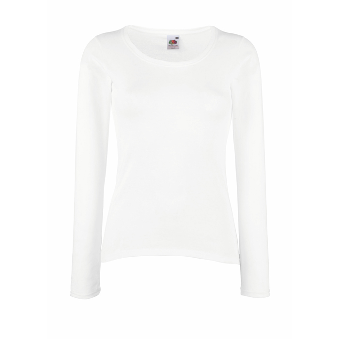 165 g/m2 (White: 160 g/m2). 100% cotton (Belcoro® yarn). Ladies` long sleeve T-shirt. New fit and longer body length. Shaped side seams for a feminine fit. Cotton/Lycra® rib crew neck with taped neckline. Fine knit gauge for enhanced printability.