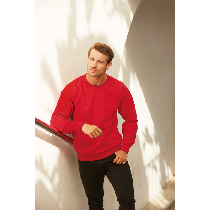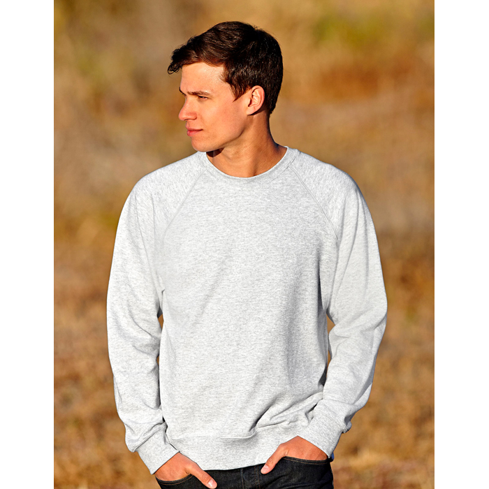 Raglan Sweatshirt made from 240 g/m2. 80% cotton (Belcoro® yarn), 20% polyester. Lightweight unbrushed fleece. Raglan sleeves. Neck, waist and cuff in cotton/Lycra® rib. Produced using Belcoro® yarn for a softer feel and cleaner printing process.