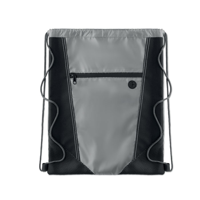 Drawstring bag in 210D polyester with 600D polyester details and nylon mesh. Has a main compartment and a zippered front pocket.