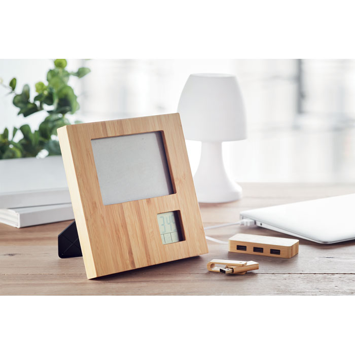 Photo frame in bamboo with weather station. Displays time, date and temperature. Alarm function and count down timer. 2 AAA batteries not included. As bamboo is a natural material, the colour per item can vary