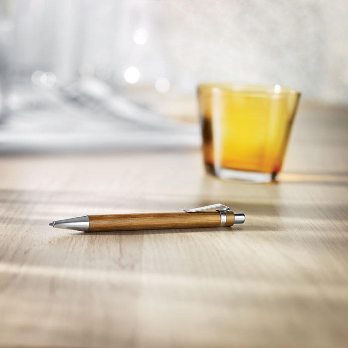 Push button ball pen in bamboo with shiny chrome fitting. Blue ink.