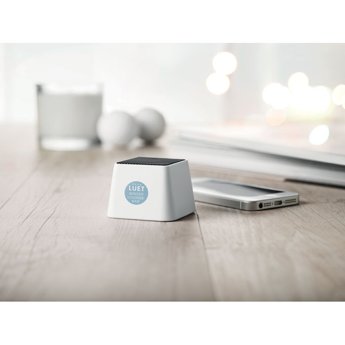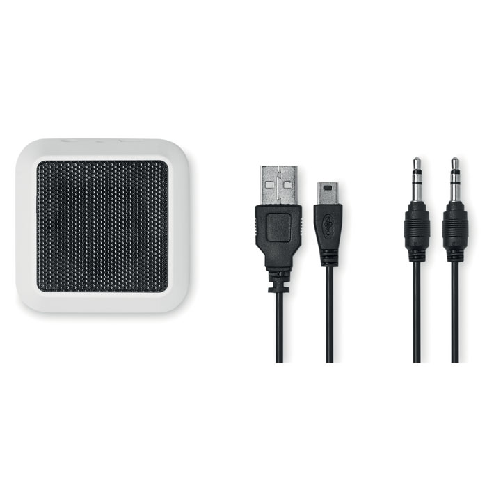 2.1 Bluetooth speaker in ABS in rubberized finish and LED light indication. 1 Rechargeable Lithium 400 mAh battery included. Including USB charging cable and 3,5 mm plug. Output data: 4 Ohm, 5V and 3W.