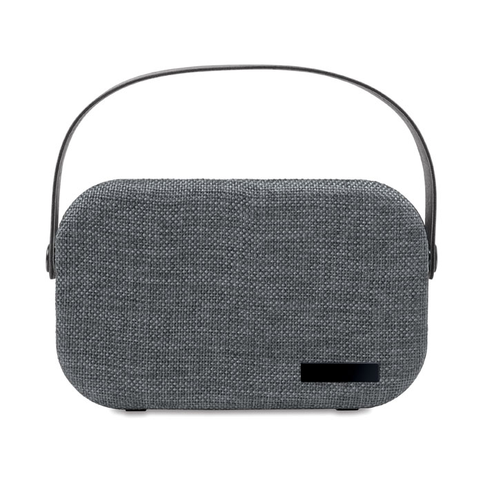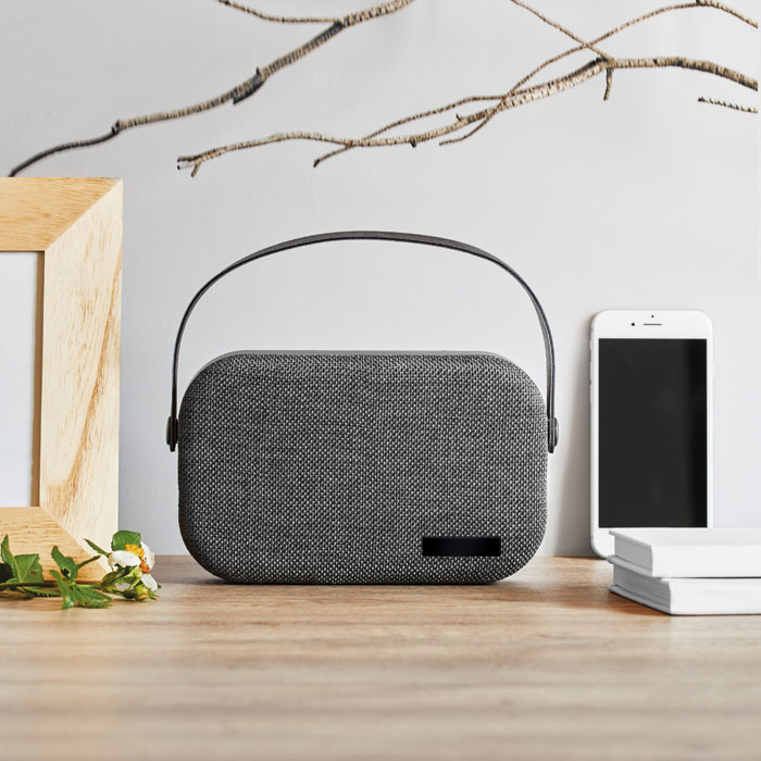 4.1 Bluetooth speaker (2 x 3W) with built-in amplifier. Rechargeable 400 mAh lithium-ion battery. PU handle for ease of carrying. Includes USB charging cable. This item includes a black aluminium plate ideal for your logo.