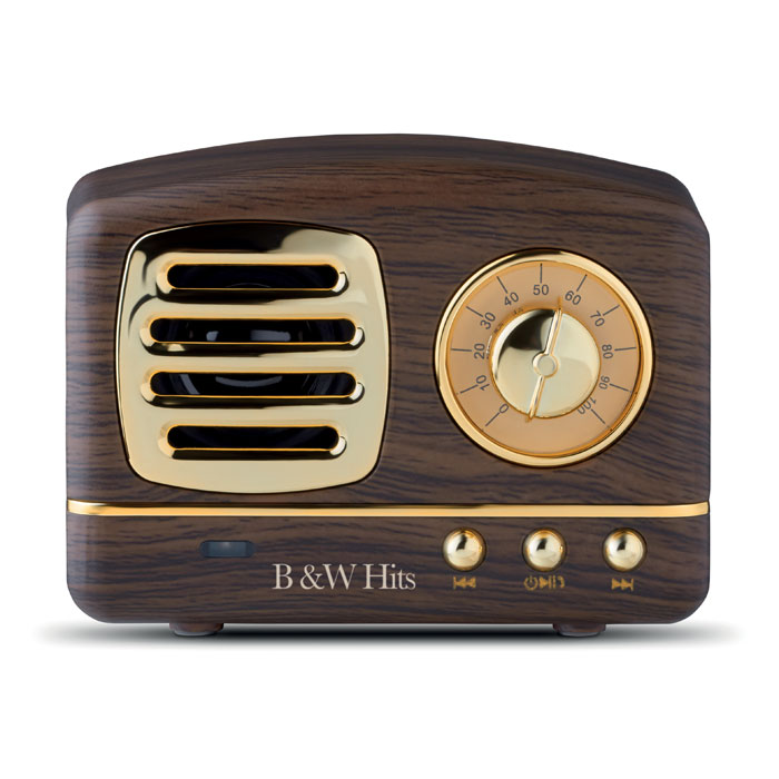 5.0 Bluetooth speaker in vintage style wood effect ABS. 1 rechargeable Li-on 450mAh battery. Output data: 3W, 4 Ohm and 5V. Micro USB cable included. Playing time aprox. 3h.