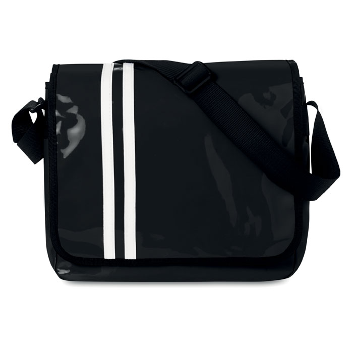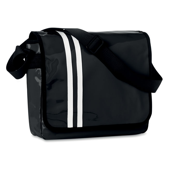 Shoulder bag in shiny PVC with contrasted lines on the flap and adjustable shoulder strap.