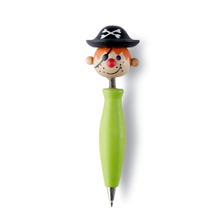 FUNWOO – Colourful wooden ball pen with funny head. Choose from a clown, pirate or princess head top. Blue ink.