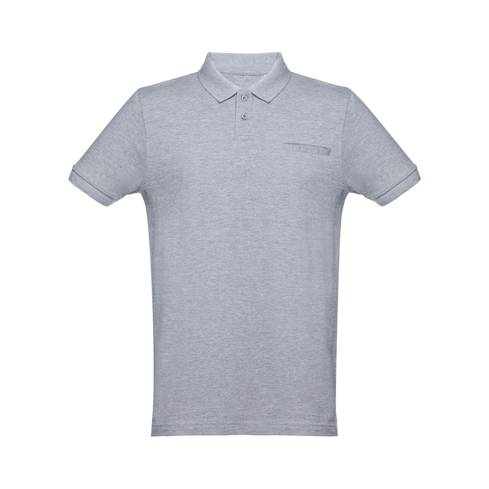 100% cotton pique men’s polo (195 g/m²). Colour 83: 85% cotton / 15% viscose. Rib collar and sleeves, rib reinforcement on collar and placket reinforced with 2 coloured buttons. Bottom with side openings. Extra button on inner seam. Cut and sewn. Jetted pocket. Sizes: S, M, L, XL, XXL