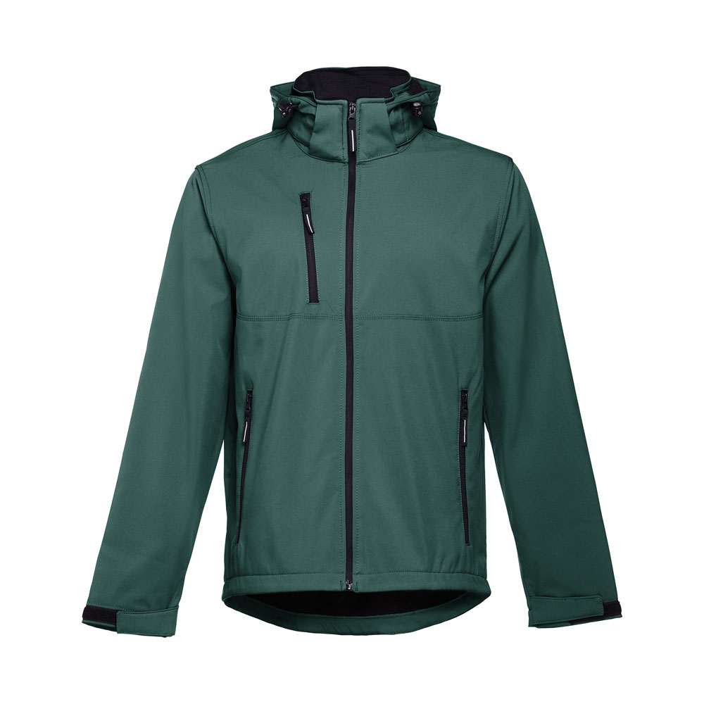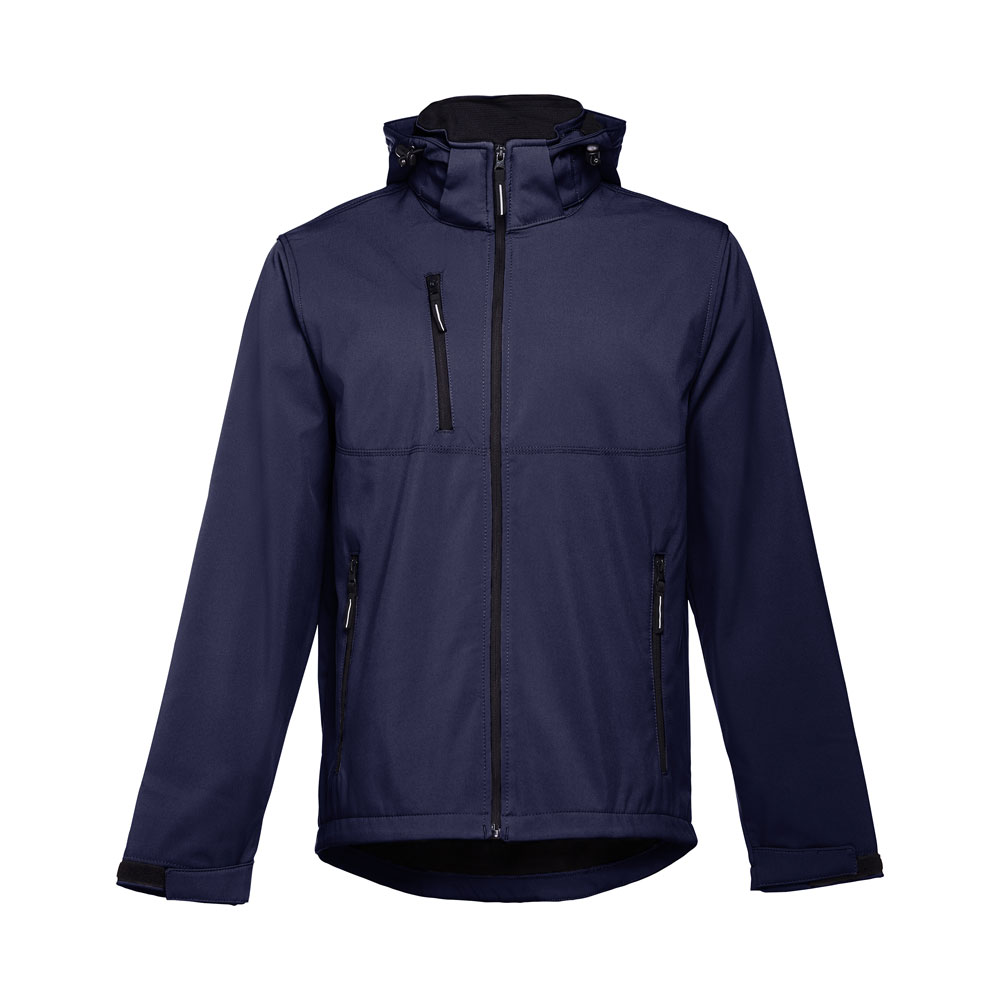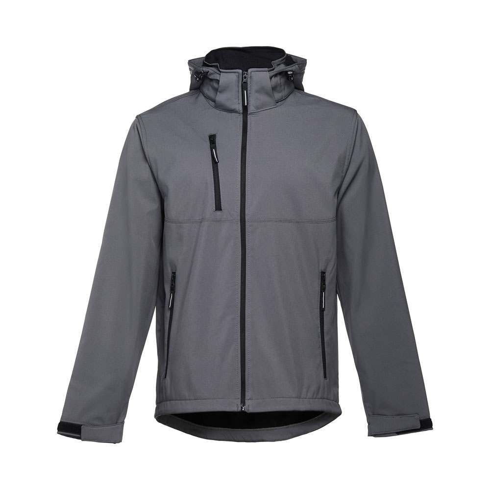Men’s softshell jacket, with removable hood in 96% polyester and 4% elastane (280 g/m²). Water repellent coating (class III). Lined with polar mesh. 2 front zipped pockets. Diagonal chest pocket with zip. Adjustable cuffs with velcro strap. Removable hood with drawstring and velcro strap to fit the collar. Rounded in the lower back. Sizes: S, M, L, XL, XXL