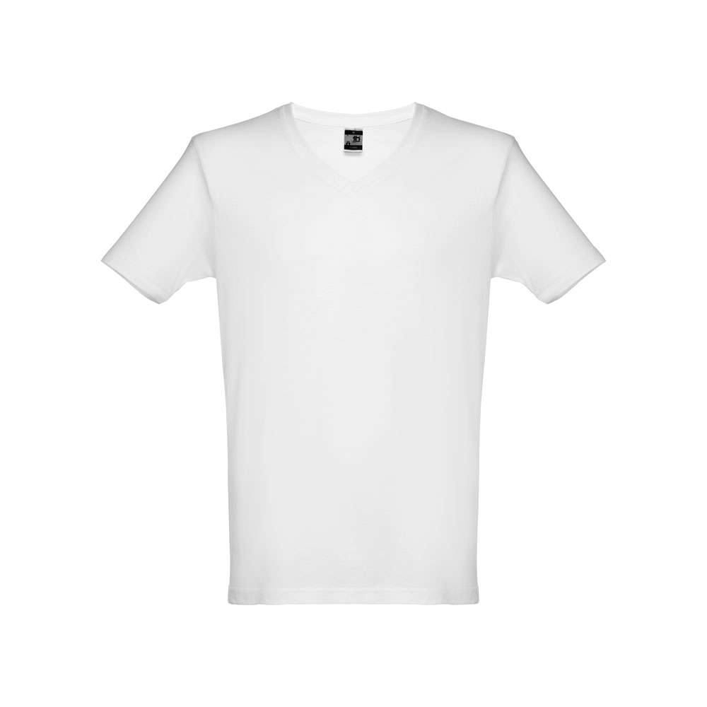100% cotton jersey men’s t-shirt (150 g/m²) with tubular shape. Short sleeve. V-neckline. Reinforcement tape. Collar in jersey. Double stitching on sleeves and bottom. Sizes: S, M, L, XL, XXL