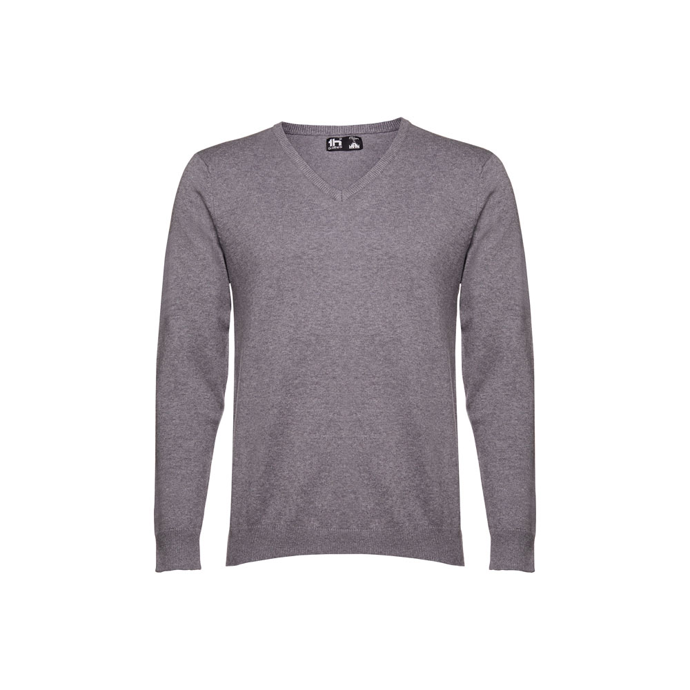 Men’s V-neck pullover in 70% cotton and 30% polyamide (220 g/m²). Rib cuffs and bottom. Sleeves inserted with fully-fashion. Sizes: S, M, L, XL, XXL