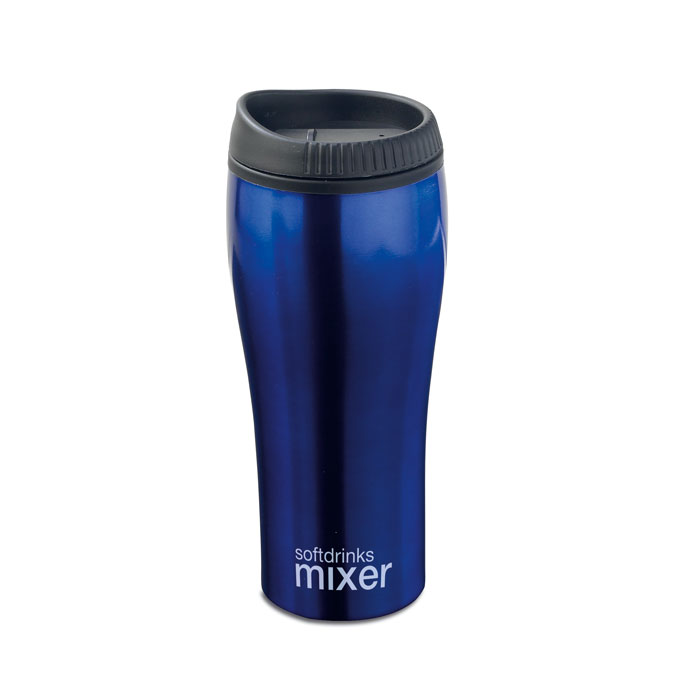 Double wall stainless steel travel mug with plastic lid in metallic or glossy colours. 500 ml