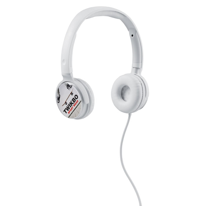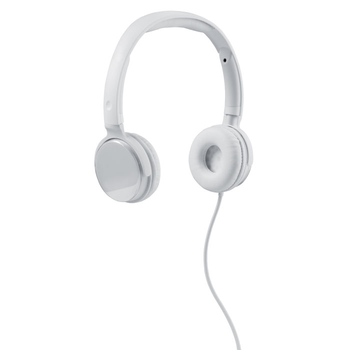 Headphones in shiny ABS casing. Has a transparent adjustable top on the outside for round paper insert. 120 cm length cable
