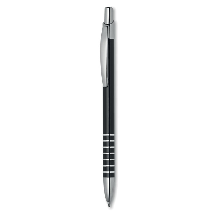 Push button ball pen in aluminium presented in matching paper box. Blue ink.