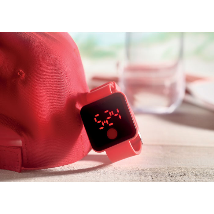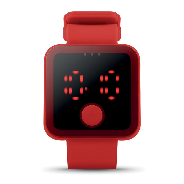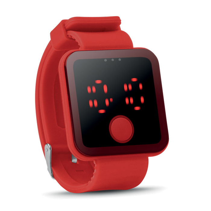 Red LED watch with silicone strap presented in box. Push the button and the time will be displayed. Displays time, seconds and date.