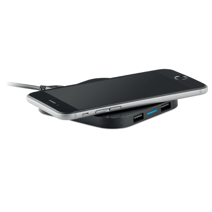 Charging pad with 2 port 2.0 hubs and USB port computer to create wireless charging dock for smartphones. Output DC 5V/ 1.0A. Compatible latest androids, iPhone® 8, 8S and X and newer.
