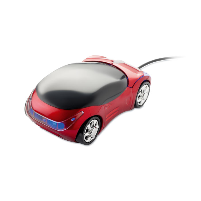 Optical mouse in stylish car shape, featuring blue lights when in use. ABS casing with metallic matt finish. 800dpi.