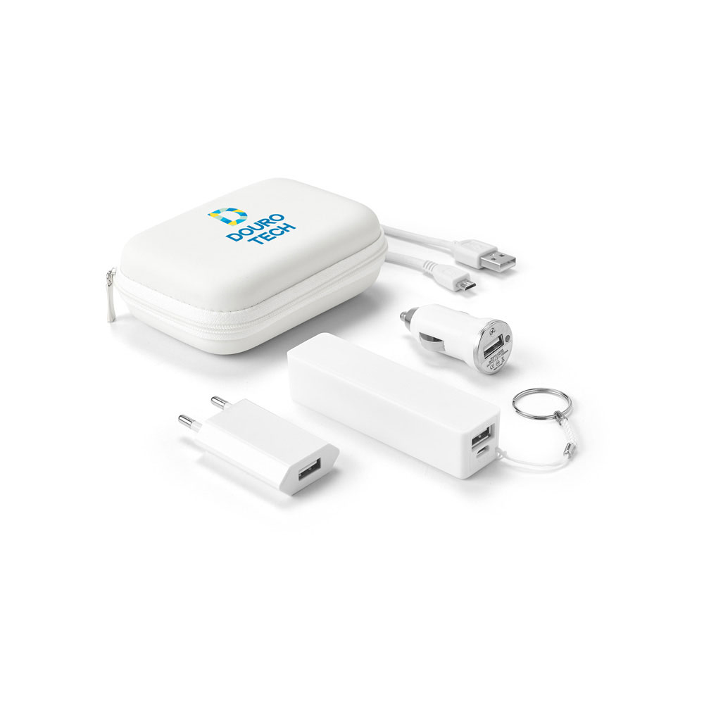 ABS battery set and USB adapters. This set includes a portable battery with lithium battery and a USB/micro USB cable. The battery has a capacity of 2,000 mAh and a lifetime of over 500 cycles. Includes car and power adapters with 5V/1A output and is supplied in an EVA pouch. Pouch: 112 x 80 x 45 mm