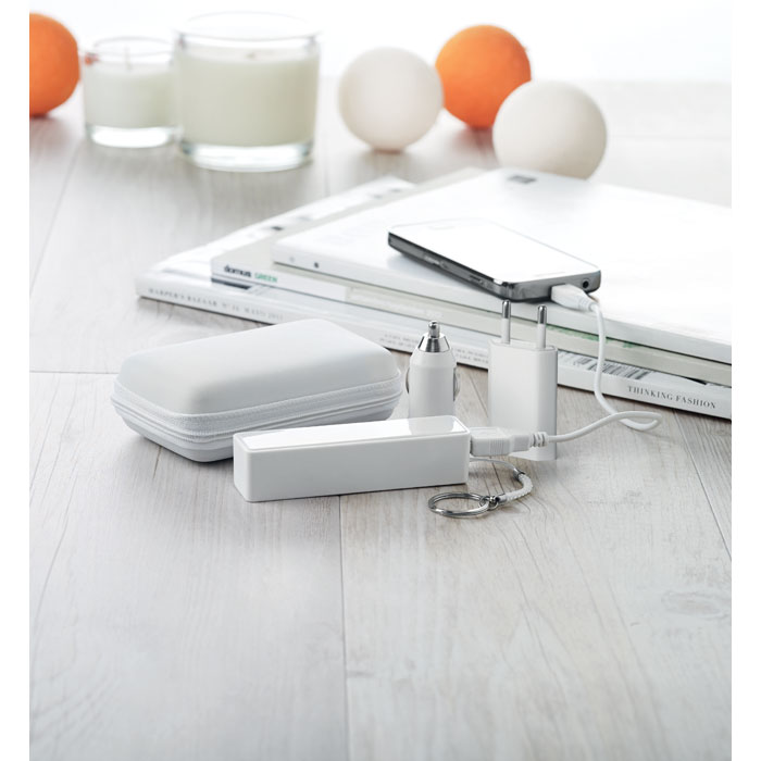 Travel set presented in EVA pouch. Includes Powerbank 2000 mAh, USB car charger, micro usb cable and USB adaptor with EU plug. Power bank output current DC5V/1A.