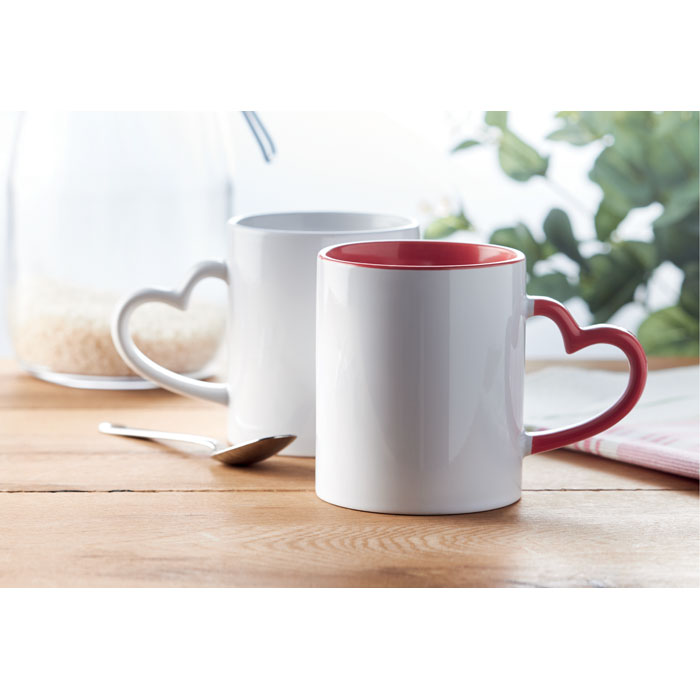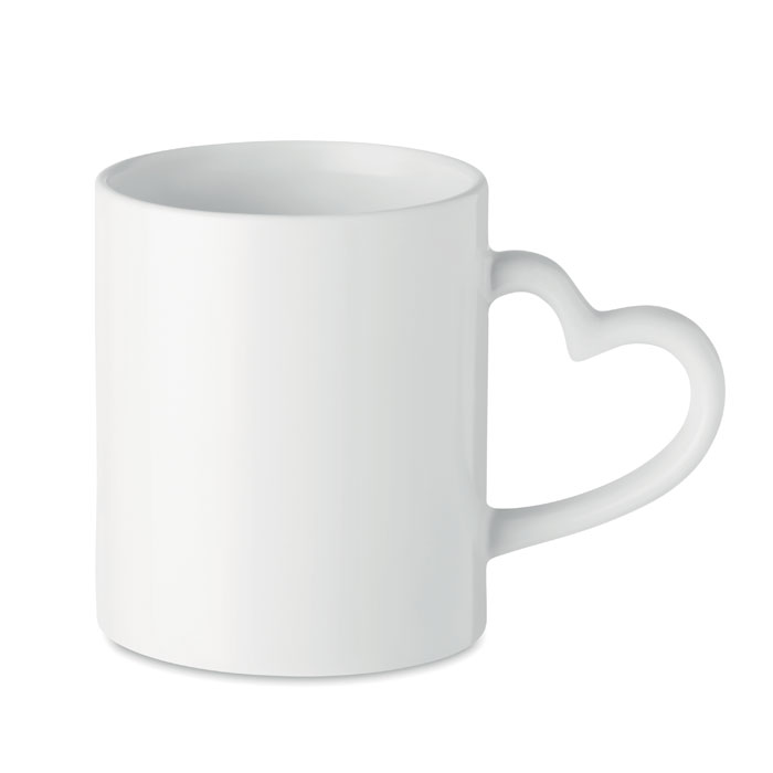 Ceramic mug of 300 ml with heart shaped handle and special coating for sublimation print. Individual packing in white carton box